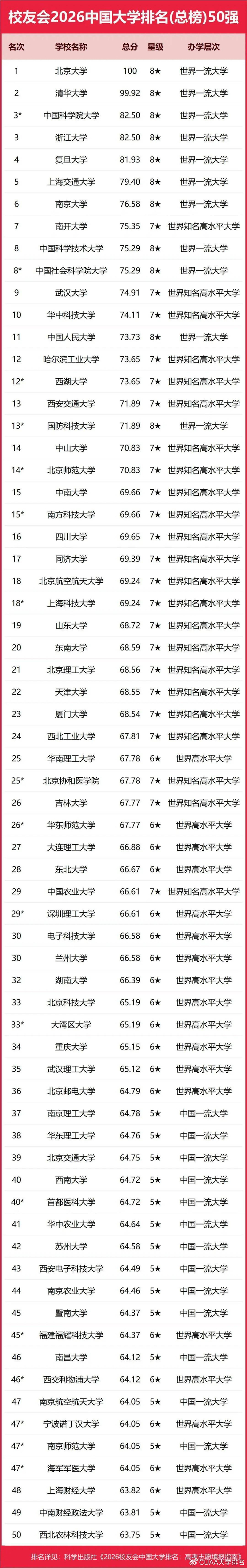 北京大学连续20年蝉联中国大学排名冠军,雄居校友会2026中国大学排名首位。清华大学列第2,中国科学院大学、浙江大学并列第3,南开大学挺进全国前7强。值得关注的是,中国民办新型研究型高校福耀科技大学、宁波东方理工大学首次纳入校友会中国大学排名,分别跻身全国50强和70强。