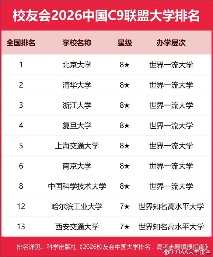 榜单显示,在校友会2026中国大学排名中,C9高校整体综合办学实力最强、办学水平最高,表现最为优秀,具有绝对的领先优势,堪称中国985工程高校的中流砥柱。北京大学、清华大学雄居校友会2026中国C9联盟大学排名冠亚军。浙江大学位居全国第三,复旦大学位居第四,上海交通大学第五,南京大学第六,中国科学技术大学第八,哈尔滨工业大学第十二,西安交通大学位居全国第十三。