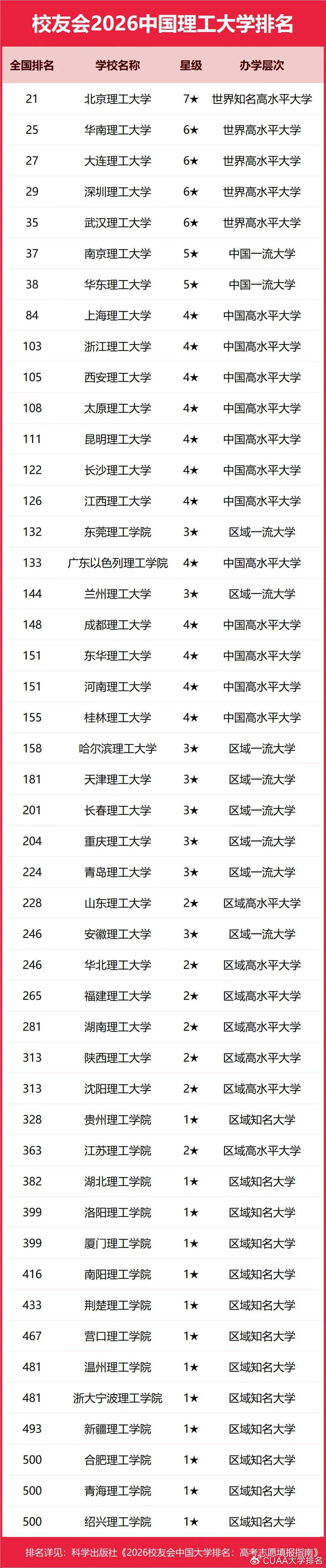 榜单显示,北京理工大学问鼎校友会2026中国理工大学排名首位,齐鲁理工学院位列2026中国民办理工大学排名第一,广西理工职业技术学院问鼎2026中国理工高职院校排名冠军。