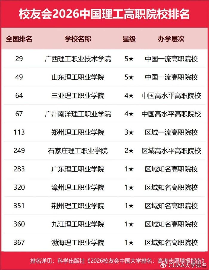 广西理工职业技术学院问鼎2026中国理工高职院校排名第一,山东理工职业学院跻身前2强