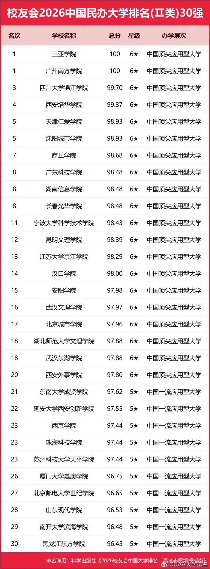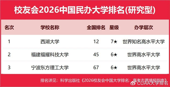 中国民办高校按照研究型和应用型2个类型进行评价,西湖大学、武昌首义学院、三亚学院、西安欧亚学院、广州南方学院雄居校友会2026中国民办大学排名第一。西交利物浦大学、宁波诺丁汉大学与香港中文大学(深圳)雄居校友会2026中国合作办学大学排名前3强。