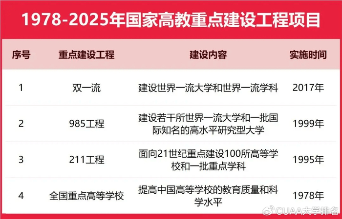 1978年至今,全国共有北京大学、清华大学、中国科学院大学、浙江大学、复旦大学、上海交通大学、南京大学、南开大学、武汉大学、华中科技大学、中国人民大学,以及燕山大学、江苏大学、陕西科技大学、东北石油大学等158所大学入围国家双一流、985工程、211工程、全国重点高等学校等四大重点高校建设名单,这些院校均是中国综合实力强、办学水平高、国家定位高的中国重点大学。