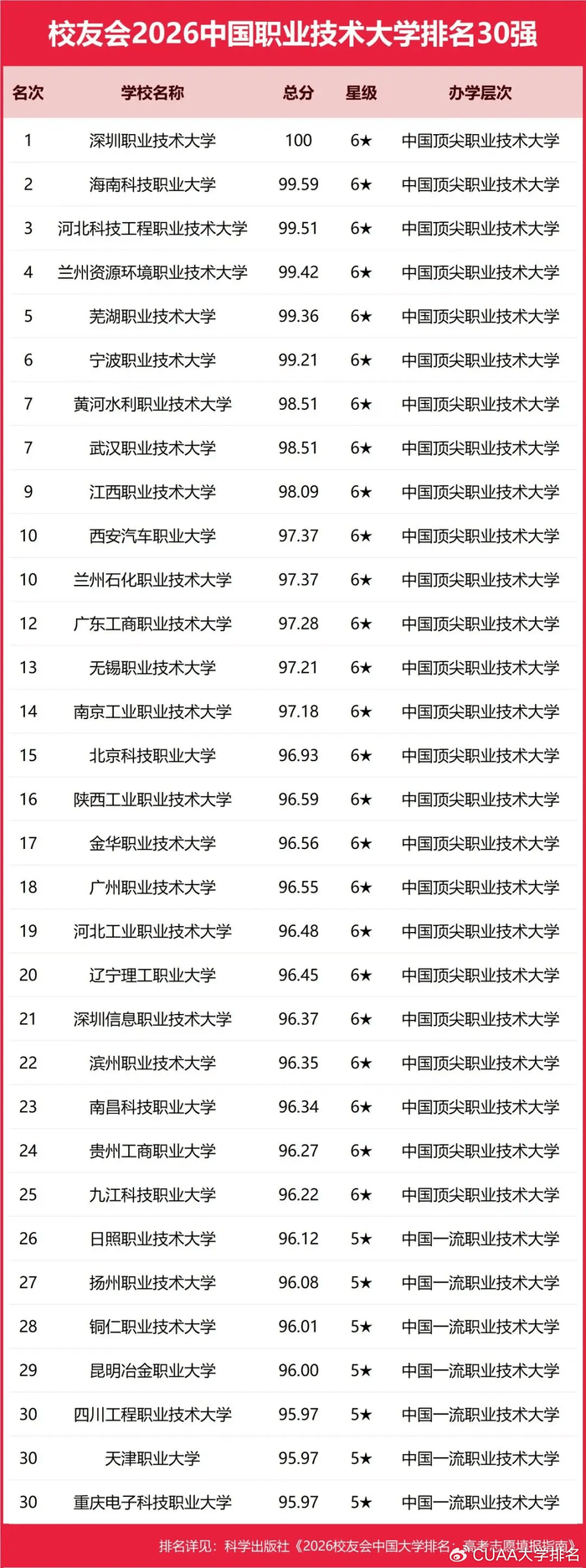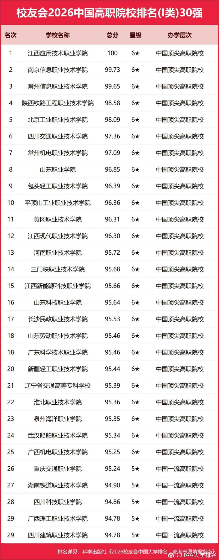 江西应用技术职业学院、合肥职业技术学院和浙江金融职业学院雄居校友会2026中国高职院校排名第一。深圳职业技术大学、海南科技职业大学和河北科技工程职业技术大学雄居校友会2026中国职业技术大学排名前3强。