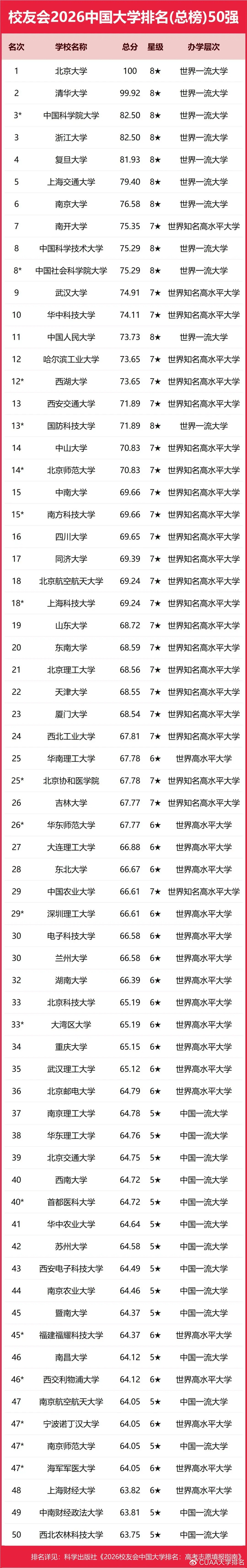 北京大学连续20年赢得中国大学排名冠军,问鼎校友会2026中国大学排名第一。清华大学列第2,中国科学院大学与浙江大学并列第3,西湖大学、南方科技大学与上海科技大学挺进全国前20强;福耀科技大学首次纳入校友会中国大学排名,跻身全国前50强。