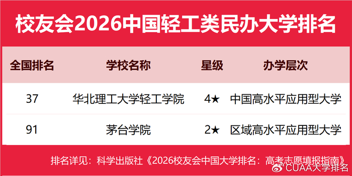 在校友会2026中国民办大学排名中,华北理工大学轻工学院全国排名第37名,雄居2026中国轻工类民办大学排名第一。茅台学院第2。