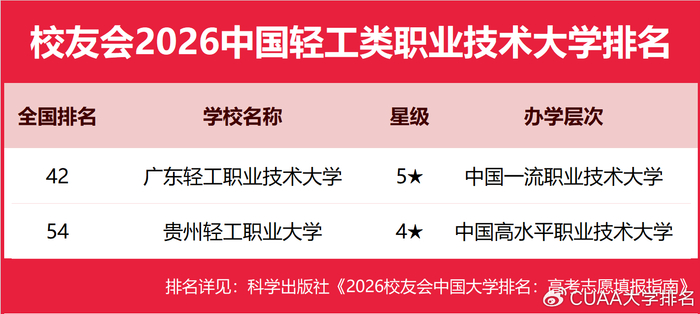 广东轻工职业技术大学雄居2026中国轻工类职业技术大学排名第一,贵州轻工职业大学跻身前3强
