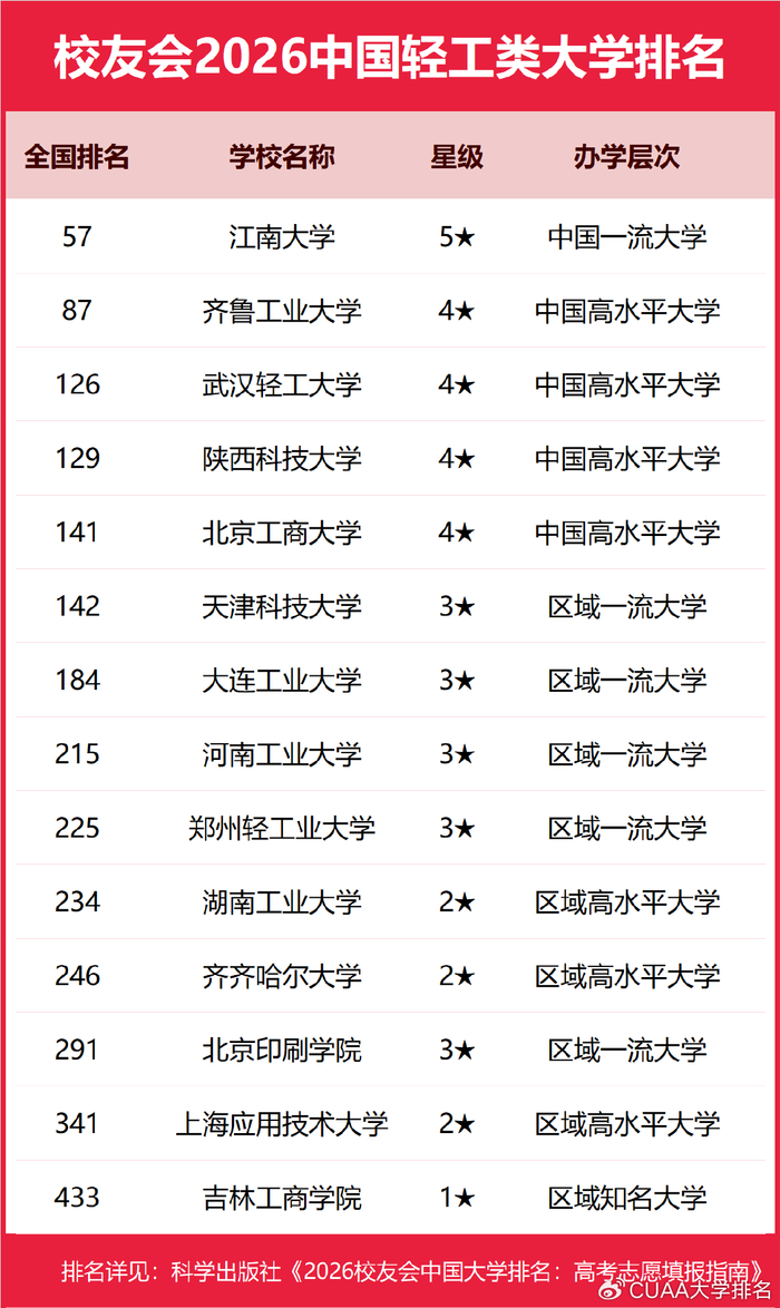 为了给2026年全国高考考生报考中国轻工类高校提供参考指南,全国第三方大学评价机构艾瑞深校友会网(Cuaa.net)撰写完成、科学出版社即将出版的《2026校友会中国大学排名:高考志愿填报指南》最新发布校友会2026中国轻工类大学排名。