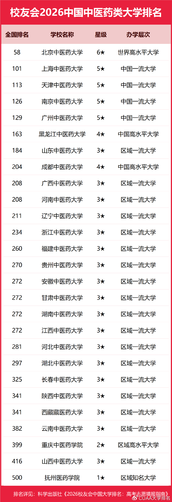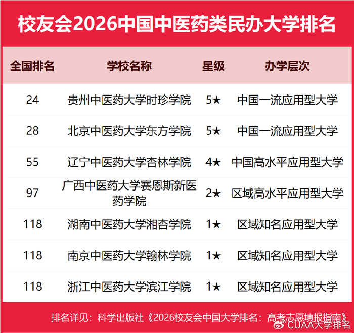 为了给2026年全国高考考生报考中国中医药类高校提供参考指南,2026年1月12日,全国第三方大学评价机构艾瑞深校友会网(Cuaa.net)撰写完成、科学出版社即将出版的《2026校友会中国大学排名:高考志愿填报指南》最新发布校友会2026中国中医药类大学排名。