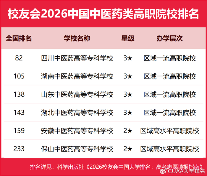四川中医药高等专科学校雄居2026中国中医药类高职院校排名第一,山东中医药高等专科学校跻身前3强