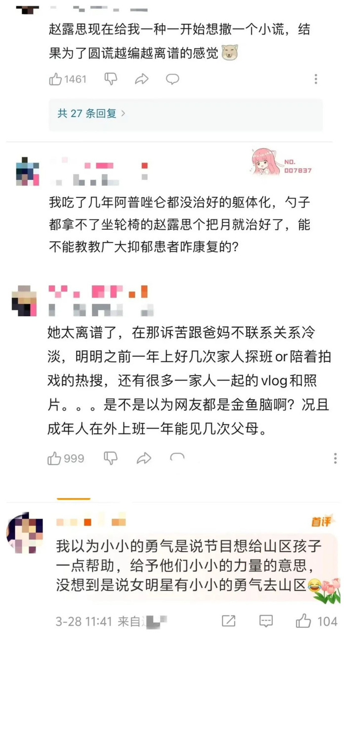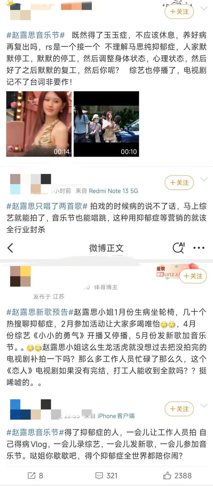 在5月1日举办的某场音乐节活动上,赵露思酷飒的唱跳现场,和4个月前经历病痛折磨的她形成了鲜明对比。这前后的巨大反差,让网友再次开启了“声讨”模式,《小小的勇气》停播风波还未平息,这场关于赵露思的舆论“审判”仍在延续。