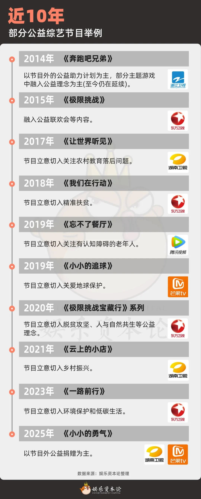 回看过往的节目,强娱乐属性的综艺节目如《奔跑吧》《极限挑战》等,在节目部分期数中融入环保、助力脱贫攻坚为主题等公益主题,如号召保护黄河生态、助力乡村农产品销售等;在节目之外,还发起了“公益跑鞋计划”,“阳光书屋”等公益活动,通过爱心义卖筹集善款购买跑鞋、建书屋。