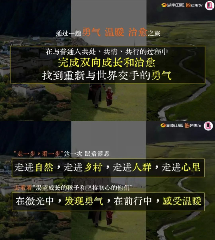 “勇气、温暖、治愈”是招商方案全文的关键词,也是《小小的勇气》定下的初步基调。“走一步,看一步”预示着原本这档节目没有太多计划,想展现随机性,表达一种“随遇而安”的心态。不难概括出,最初版《小小的勇气》打算以旅行体验为载体,用“温暖”“勇气”串联起明星与素人的情感共振,本质是一档主打情绪价值的慢综艺。