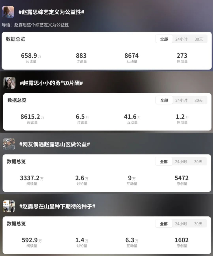 再回归到近期《小小的勇气》,相关热搜话题全部以赵露思为中心扩散。节目所体现的“公益性”更多是借助艺人自带的流量引发大众对偏远地区的关注。根据网友后续的反馈,三个月内《小小的勇气》带动山区经济,修建了路灯,给学生捐赠了校服,设立非遗助学金助力手艺传承,并有效增加了非遗产品的销量。而节目正片中,无论是赵露思还是制作团队似乎都隐去了“主观能动性”,没有身体力行的去做实际能帮助到村民的事件,这也成为了节目的一大争议点。