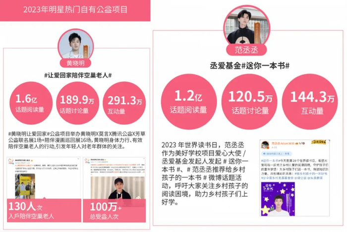 一来,注入“公益基因”不仅可以提升综艺节目的社会价值,还可以通过线上发起公益话题挑战、线下组织志愿者活动等,实际完成公益行为落地。另一方面,明星本身的公益影响力也能反哺节目,为节目的公益信任度背书。