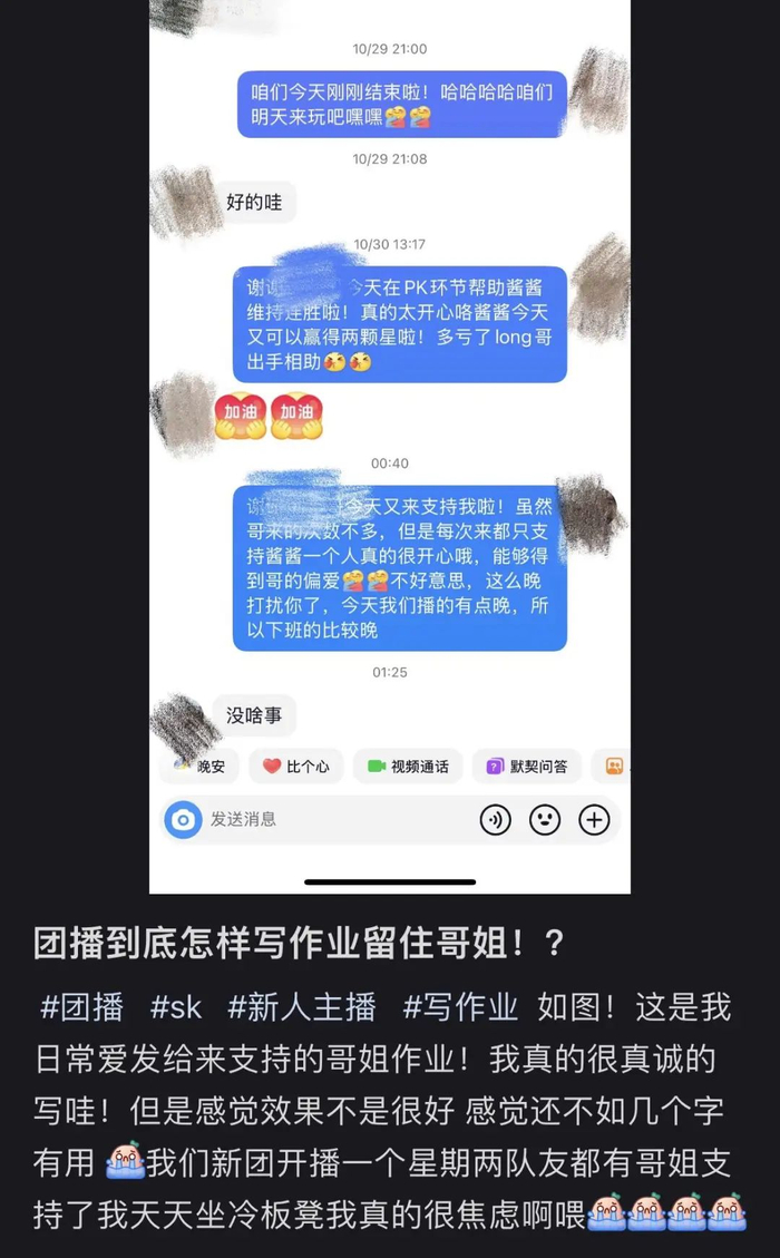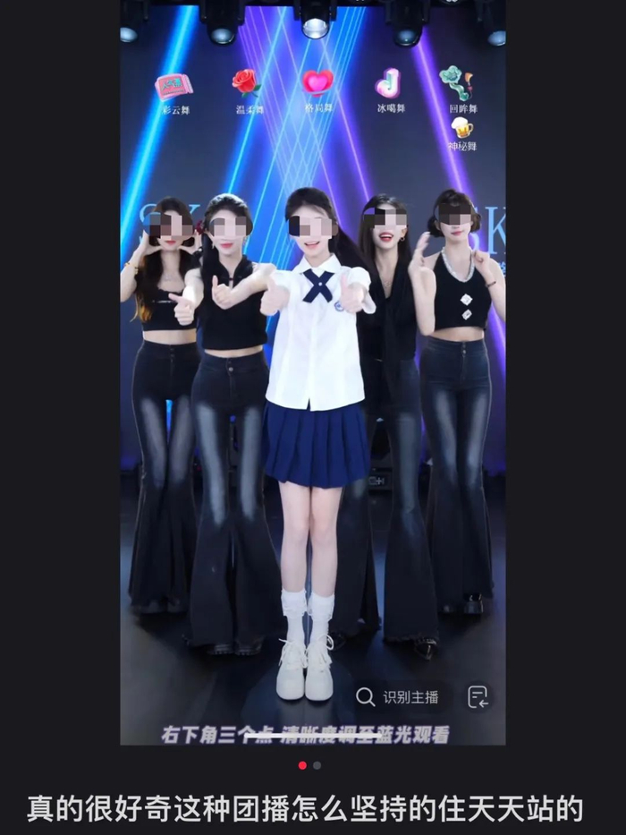为此,小娱暗访了一家团播公司,采访了2位做过团播与娱乐主播的从业者,发现这个行业远没有想象中“高保底、低工时”:一些公会为了快速起量签约未成年主播;一些主播受不了天天和大哥“做作业”;再一个团播播主之前明争暗斗、互抢化妆师让人心力交瘁;还有一个“一晚200个蹲起”等惩罚性PK更是把体力和青春都消耗殆尽……