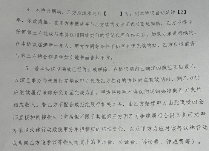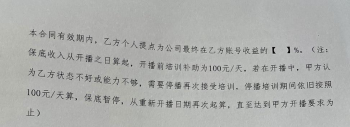 在奔奔翻阅合同的过程中,她发现比起劳务合同,这份文件更像是经纪合约。在合同中写有所有的“商务”“账号”都归公会/公司管理,如若恶意违约,将需要赔偿违约金。违约金=乙方发生根本违约行为之日之前的最高月收益x剩余合作月数。而当她问何为“根本违约行为”时,负责人并未给出一个足够清晰的标准。