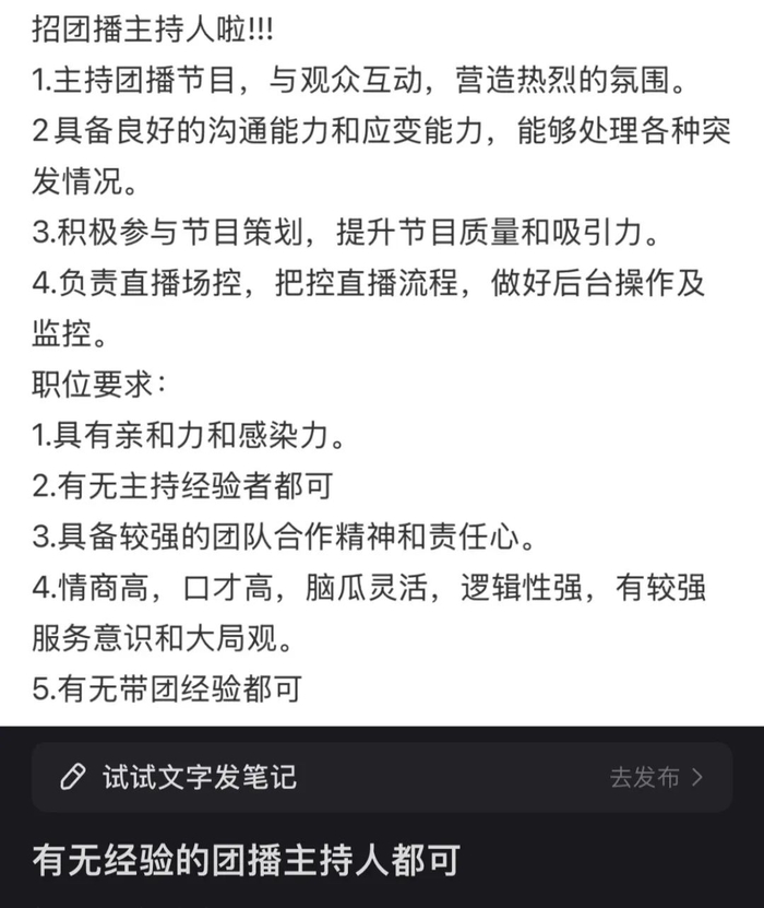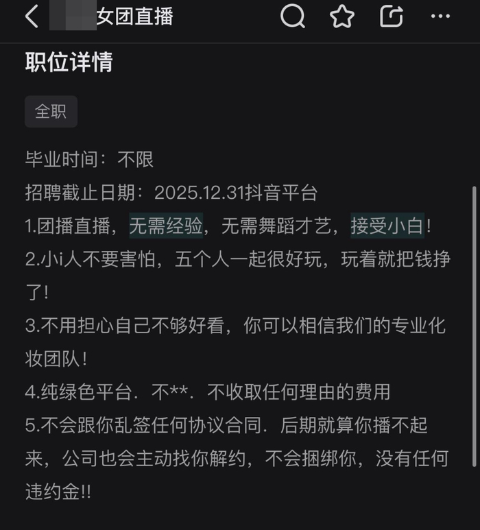 挂出求职信息和“直播”的求职方向的几小时后,就收到了好几家公司的面试邀约,在不同公司挂出的详情页面上,相当一部分信息是一致的:“简单易学,可零基础免费培训”“直播美颜功能强大,自信最重要”“有舞蹈功底可以加分但不是必要”……