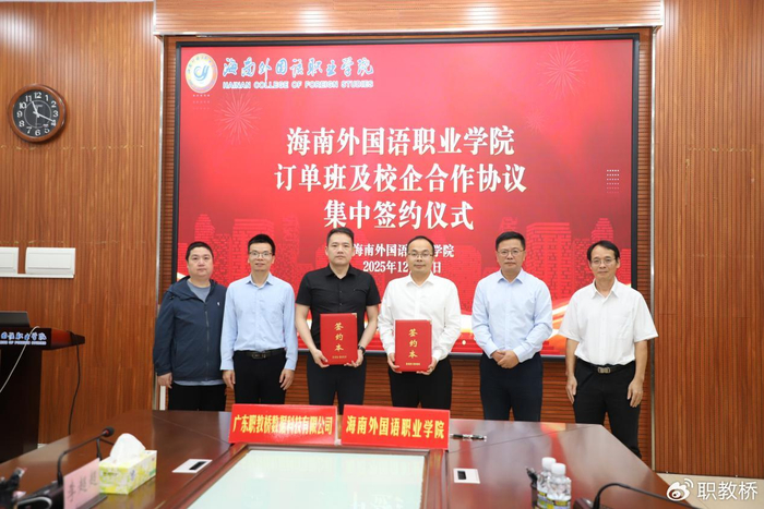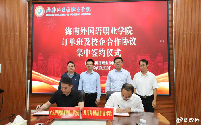 2025年12月12日,广东职教桥数据科技有限公司与海南外国语职业学院举行校企合作签约仪式。双方将围绕产业研究、专业建设、人才培养、师资培训等多个领域展开深度合作,共同构建产教融合协同育人新机制,为海南自由贸易港建设提供高质量人才支撑。