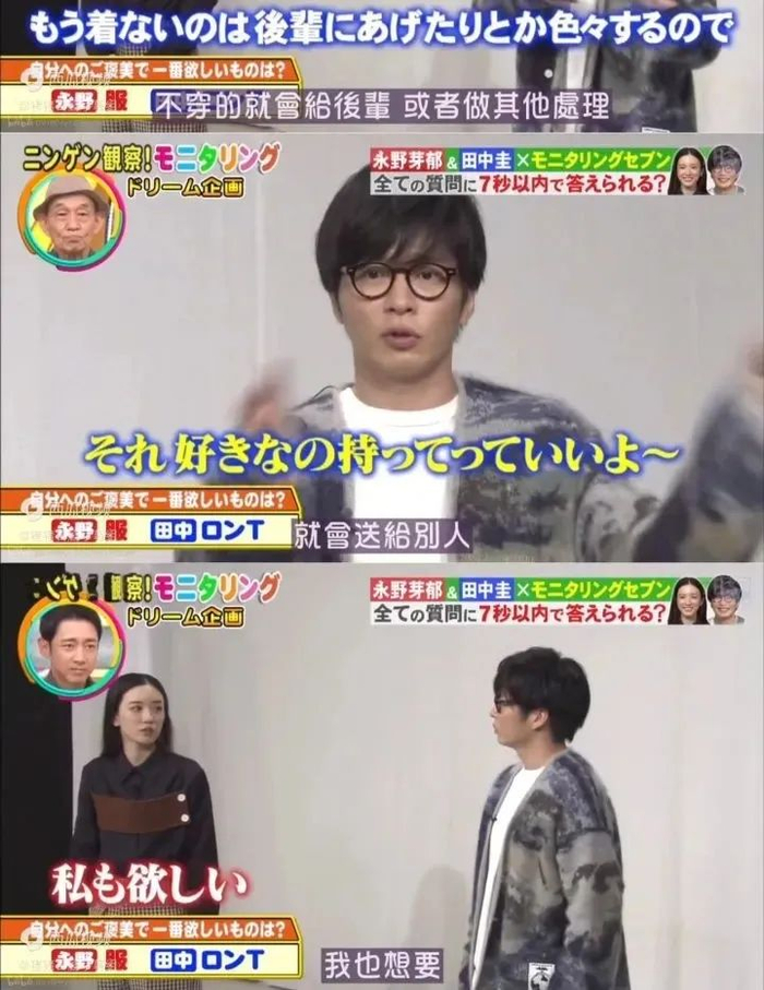 在节目上,向田中圭索要穿过的汗衫,态度暧昧,令人毛骨悚然,妹子你醒醒啊。