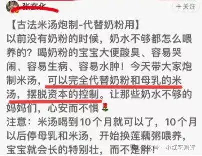 前两天,一个几百万粉丝的大V「张某化」被封号了。他打着反资本的旗号,忽悠宝妈用米汤代替母乳和奶粉。