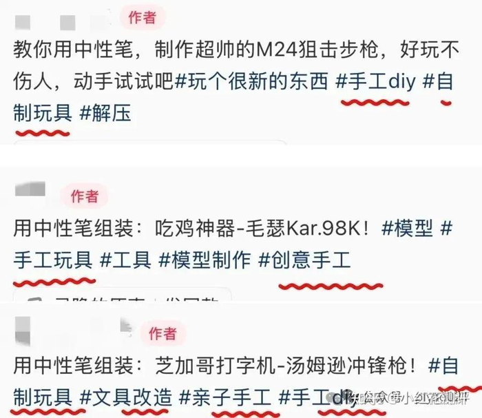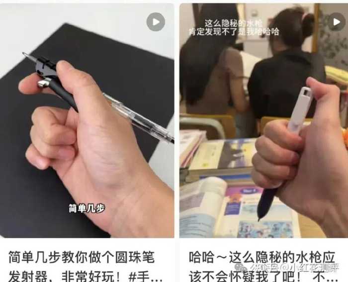 「笔枪」能流行起来,也离不开这些视频博主炫酷的演示和「学校可做」的标签,这样的内容似乎变相暗示、鼓励着更多的青少年去模仿。