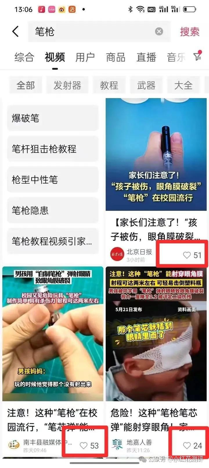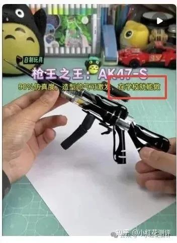 而且花爸发现,在各大视频平台上,教别人如何做出这种「笔枪」的视频点赞颇多,很多都有几万十几万点赞的,而这些组装视频里,有的还刻意强调「在学校就能做」「好玩不伤人」。