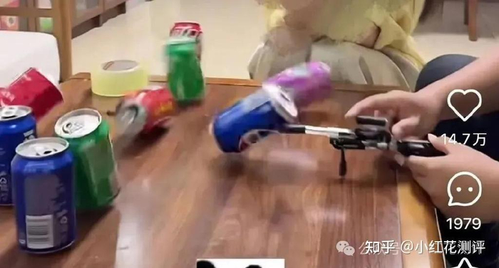 虽然百分百达不到真枪一般的攻击力,但根据测试,其射程能有两米远,轻易便能击倒矿泉水瓶,甚至能够穿透作业本!