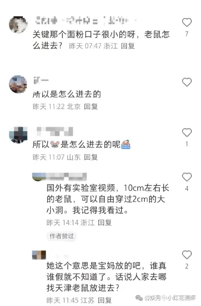 之前评论里就有人说:老鼠没办法钻进面粉包装上那么小的口子,背后意思就是他认为那个宝妈是摆拍诬陷品牌。