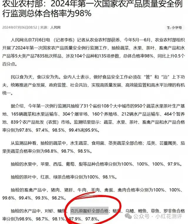 在水质不错的环境中,人工养殖的小龙虾才能够长得更快,再加上小龙虾的售卖和检疫体系也已经非常成熟,市场抽检的合格率非常高,国家市场监管总局2024年第二季度抽检数据显示,小龙虾铅、镉等重金属合格率达99.7%,高于水产品平均水平。因此这种情况下无需担心重金属超标的问题了。