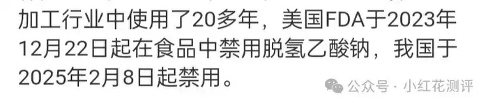 别的不说,漂亮国是2023年12月22号禁用脱氢乙酸的,而我们今年2月8号禁用,看上去确实晚了一年零两个月。