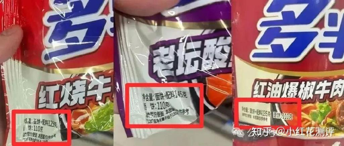 不过花爸了解到,白象的「多半」虽然是商标,但实际分量也确实更多一些,白象一般的方便面饼重量是60-70克,白象的「多半」系列面饼是100克左右。