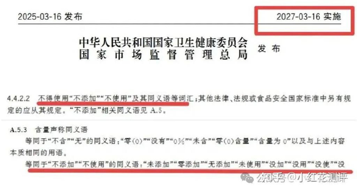 根据新版的《预包装食品标签通则》,从2027年的3月16日起,食品标签上不能再使用「不添加」、「不使用」等同义词汇。
