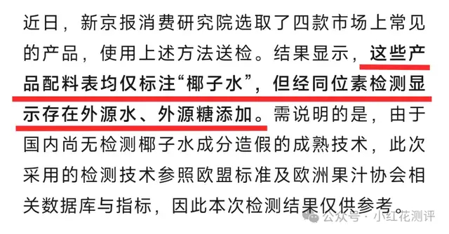 这里的「外源」二字,就是指「本不该出现在纯椰子水里的东西」,是厂家额外往里掺的水和糖。