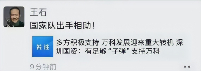 事后,王石疑似稳定投资人的情绪,在朋友圈转载了该消息,并评论说“国家队出手相助!”。