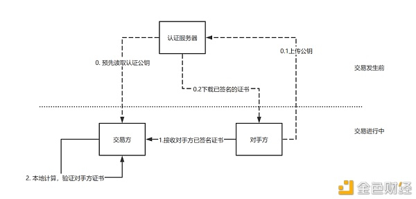 当交易行为发生时,交易方会内置认证服务器的公钥。同时,交易方会接收到对手方的数字证书信息。