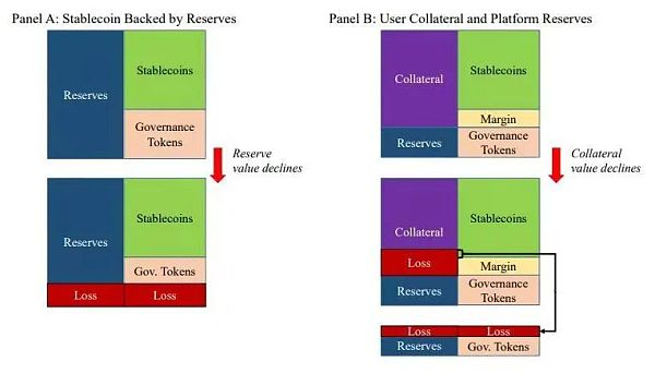图一加密货币影子银行。这说明了稳定币的两种结构。如图一所示,在面板A中,一个平台发行由其储备金支持的稳定币。多余的储备金,即股权地位,属于拥有控制权(即对平台政策的控制)的治理代币持有人。当储备金投资于风险资产时,潜在的损失由股权头寸吸收。只要稳定币是超额抵押的,其价值就不会受到影响。在B组中,稳定币同时得到了用户的抵押品和平台的储备金的支持。当抵押品价值下降,用户无法满足保证金要求时,平台就会清算抵押品,并使用所得收益(和自己的储备)在二级市场上买回稳定币。