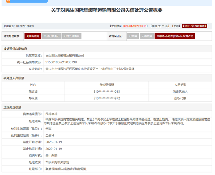 近日,军队采购网发布《关于对民生国际集装箱运输有限公司失信处理公告概要》。公告显示,因围标串标,根据军队供应商管理相关规定,禁止3年内参加全军物资工程服务采购活动的处理。在禁止期内,法定代表人陈文波控股或管理的其他企业禁止参加上述范围军队采购活动,授权代表郑永康禁止代理其他供应商参加上述范围军队采购活动。