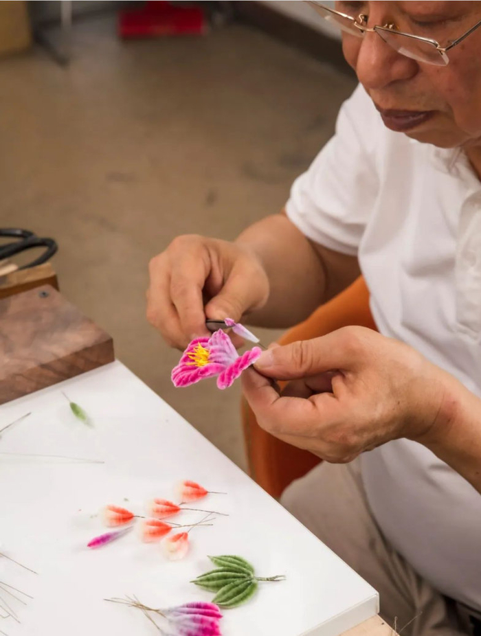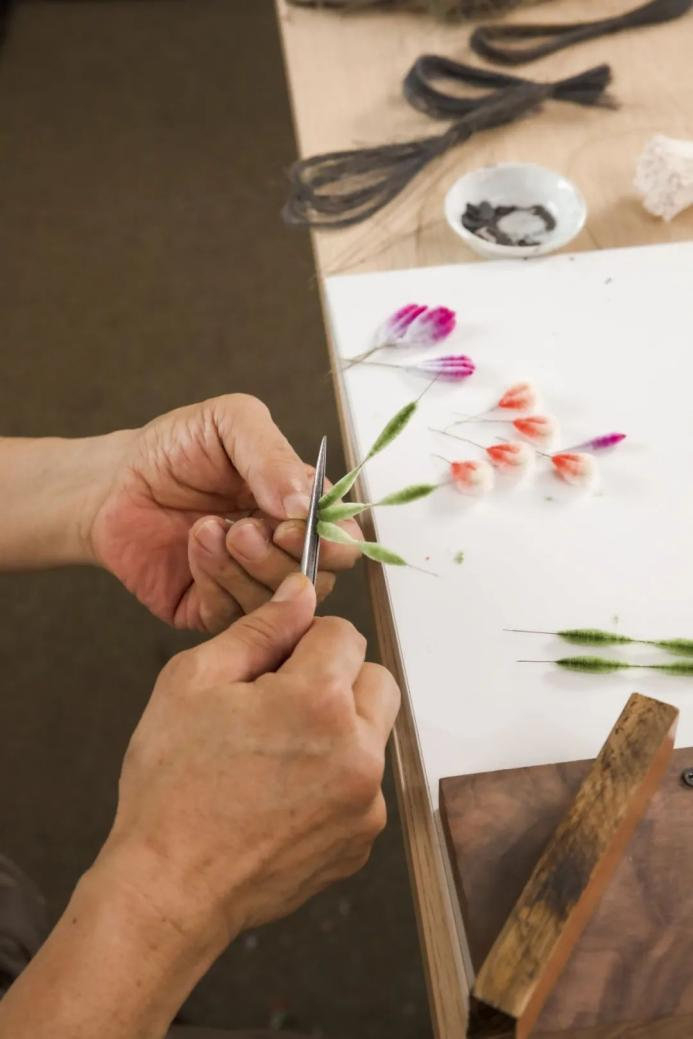为了准备相应的材料,仅仅是订购全新色彩的蚕丝就花费了不少心思。“这样的独特尝试需要下很大功夫,但我们还是想试试。”他想看看,在这样的色彩搭配下制作出的绒花,到底会呈现怎样的效果,赵树宪很好奇。