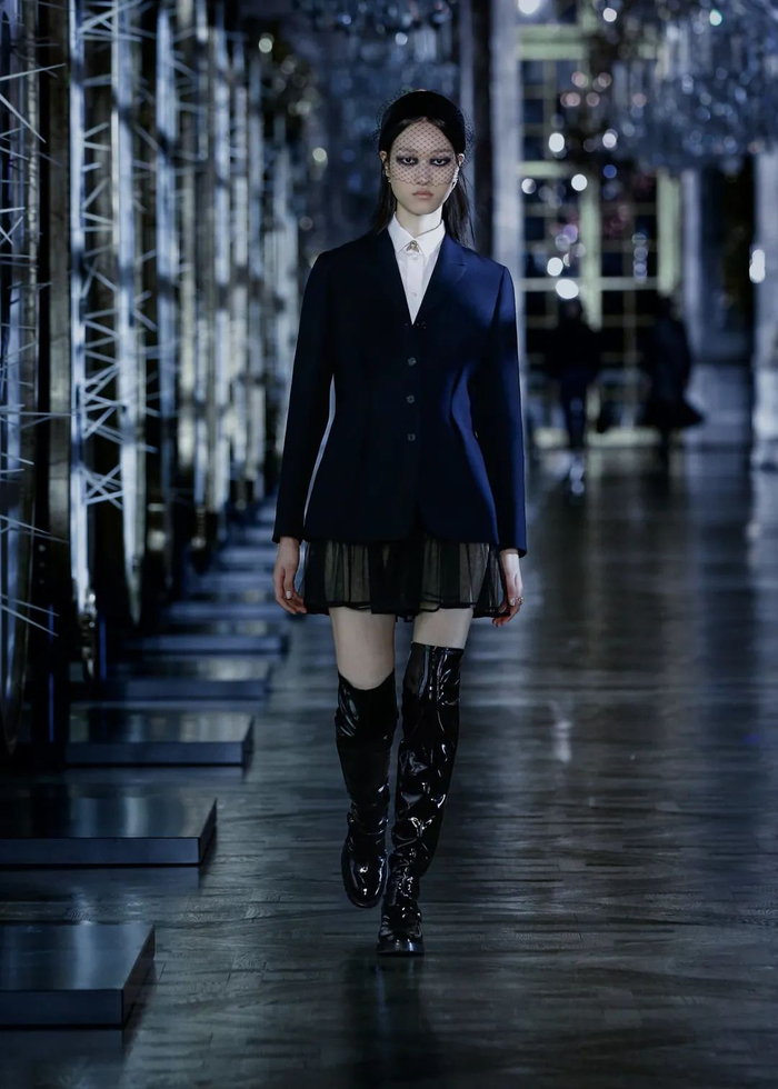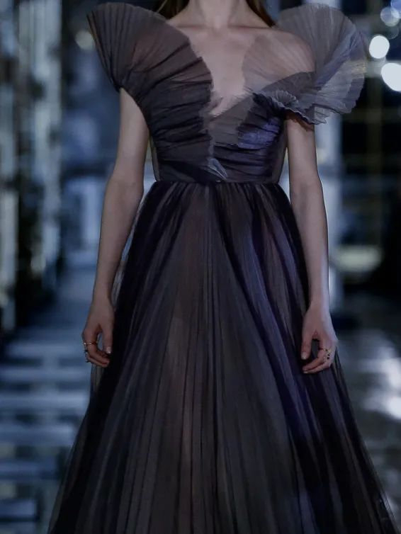 迪奥标志性的纱裙结合了精湛的工艺和如梦如幻的浪漫意境。本季的纱裙除了运用到柔软的浪漫色彩,还大量使用黑色或深色,如同女性内敛而又深厚的内心力量。