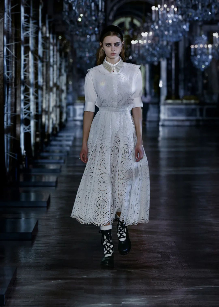 白色衣领、英式刺绣胸饰和白色复古袜也让人不由地联想起童年时光。