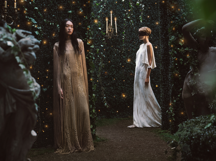 曼妙廓形在秘境树篱中隐现,时装灵感与奇幻巧思在此交织,匠心臻作映衬华美造型,诗意描绘迪奥优雅风格精髓。
