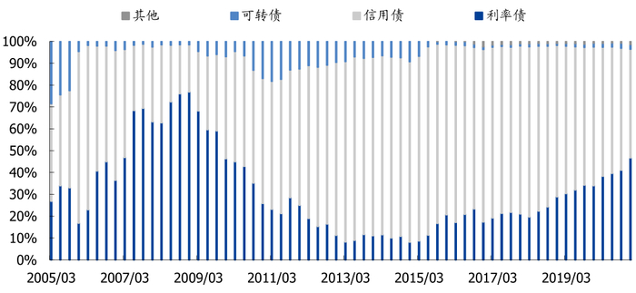 利率债与信用债配置比例受信用利差和宏观环境影响。根据无风险利率和信用利差的相对位置,可以衡量利率债和信用债的比价,理论上信用利差越高信用债性价比越高,债基会增加信用债配置而降低利率债配置,信用利差与信用债持仓市值/利率债持仓市值正相关。但实务中债基信用债配置还受到诸多宏观因素的影响。2011年信用利差来到历史高位,但这是基准利率大幅上行、信用债供给在2010年低位基础上反弹、资金利率中枢抬升、波动性增加导致息差保护空间收窄和严重违约风险担忧情绪等因素催化下的结果,债基无力也无意愿增配信用债;2016年,我国债券市场信用风险加速暴露,违约事件频繁发生,违约事件的发生趋于常态化,信用风险逐步释放背景下债基信用债持仓市值/利率债持仓市值逐步下滑。