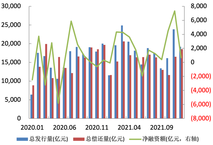2021年同业存单共发行21.8万亿元,较2020年增长2.83万亿元,增幅15%;净融资规模达到近2.78万亿元,规模较2020年大幅提升2.36万亿元。各月份存单净发行量差异显著,整体以净融入为主,其中仅1月和6月为净回收,其余月份均表现为净融入。发行节奏也较往年提升,上半年存单累计净融资达到了全年净融资额的61%,发行进度处于2018年以来同期较快水平。