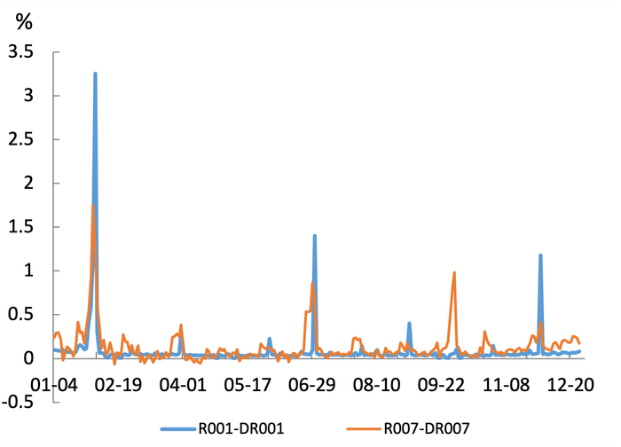 图1 2021年全市场与存款类金融机构质押式回购利差走势图
