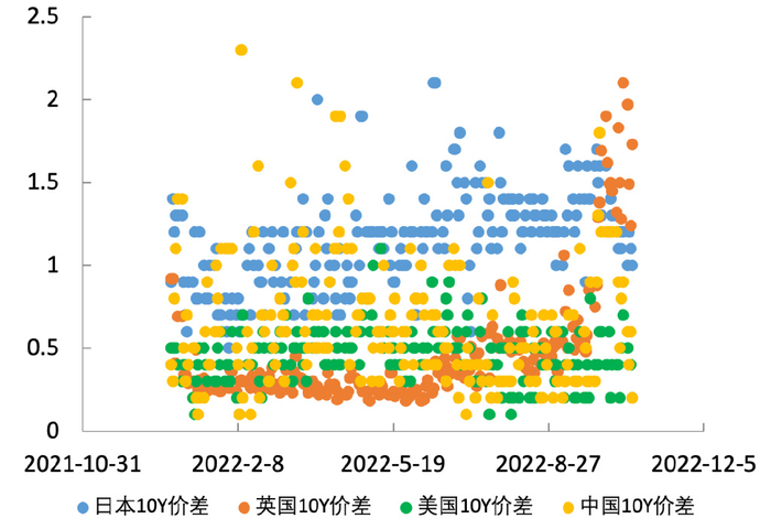 图2 2022年以来中美英日10Y国债报价价差对比