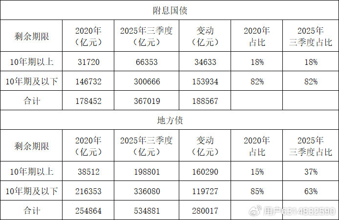 地方债方面,10年期以上超长债的体量从2020年的3.85万亿元提高16.02万亿元至2025年三季度末的19.88万亿元,年均增速高达42.7%;而同期地方债的体量提高了28万亿元,年均增速仅有17%;相应地,地方债中的超长债比例从2020年的15%大幅提高至2025年三季度末的37%。换言之,近五年57%的增量地方债都是超长债。