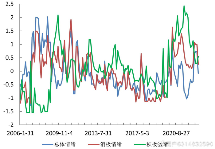 基于上述研究设计,本文就得到2006年到2022年6月美联储政策报告文本情绪。具体包括积极情绪、消极情绪和总体情绪,其中总体情绪由消极与积极情绪相减得到,因此总体情绪越高,表明美联储越悲观。计算结果显示(如图2):一是2008年金融危机期间,美联储政策报告的情绪总体波动较大,其中积极情绪处在较低水平,消极情绪较高,美联储总体情绪处在高位。表明金融危机爆发对全球经济冲击严重,美联储对经济基本面持续持悲观态度。二是2020年新冠疫情暴发以来,美联储总体情绪明显上升,经济严重衰退和新冠疫情的不确定性扰动其对未来经济的判断。随着疫情的缓解,2021年美国经济逐渐从经济衰退中恢复,美联储积极情绪攀升,但受限于世界经济恢复程度,消极情绪仍维持在高位。三是2022年以来,美联储报告中的积极情绪急剧下降,消极情绪提高拉升总体情绪,主要由于俄乌冲突触发的全球不确定性水平提高,叠加大宗商品价格攀升,美国遭遇严重通胀。