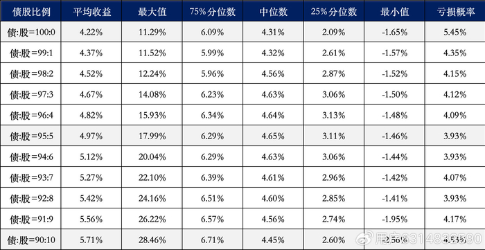 模拟组合的收益测算结果显示,增配5%左右的股票不仅可提高组合的总体收益,同时能降低亏损风险。为了解不同股债投资比例下组合的预期收益和投资风险,本文构建了模拟组合并进行了一系列的测算。组合选择万得全A指数来表征股票资产,选择中债新综合指数来表征债券资产,并设定投资组合的时间期限为1年,计算组合从2005年11月到2025年10月每天的年化收益率。当模拟组合底层资产100%为债券时,过去20年时间组合年化收益率的平均值为4.22%,组合年化收益率的中位数为4.31%,持有组合的最低收益为-1.65%,最高收益为11.29%,组合亏损的概率为5.45%。当组合资产结构调整为“95%债券+5%股票”后,组合的收益水平明显提高,且亏钱的概率降低。新组合年化收益率的平均值提高到4.97%,年化收益率的中位数提高到4.65%,最高年化收益率提高到17.99%,且持有组合一年亏钱的概率降至3.93%,持有组合的最低收益为-1.46%,增配股票资产后组合的收益表现强于纯债组合。