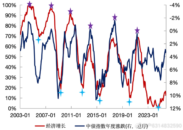 经济周期波动将影响股票和债券的胜率。为量化经济周期波动,本文选择了外需、耐用品消费、地产需求、工业企业资本支出、M1和财富效应六个指标来构建经济周期指标。构建的经济周期指标不仅与实际GDP增长正相关,且该指标的周期弹性更高。不仅如此,该指数与万得全A指数呈高度正相关性,且与中债新综合指数的收益率明显负相关。比如说,当经济周期处于周期底部位置时,即图3中四角星附近的位置,投资股票的胜率将增加,而投资债券的胜率将下降。因为经济从衰退转向复苏阶段,企业盈利增加将支撑股市上涨,实体经济融资增加将利空债市。与之相反,当经济周期处于复苏顶部位置时,即图3中五角星附近的位置,投资债券的胜率将提高,而投资股票的胜率将下降。因为企业盈利逐步减少将拖累股市,实体融资需求减少将支撑债市走强。
