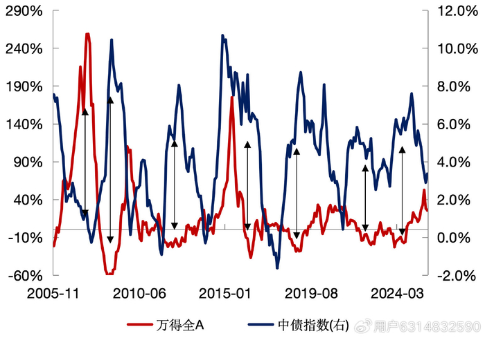 股债资产分散化投资降低了组合的风险,本质上源于股债资产的负相关性。现代投资组合理论的倡导者哈里·马科维茨已经论证过,分散化投资可以在不牺牲预期收益的情况下降低风险水平。表1中的中国资产数据也说明了同时配置股债资产不仅可以提高组合预期收益水平,还能降低组合亏损的概率,主要原因是股债资产在收益率上表现出了负相关性。图2是持有万得全A指数1年能获得的年化收益率以及持有中债新综合指数1年能获得的年化收益率,两类资产在多数时间显示出负相关关系,所以同时配置两类资产改善了组合的业绩表现。